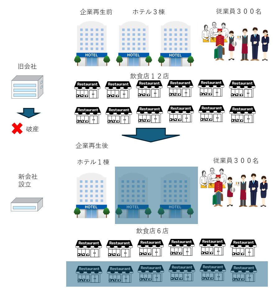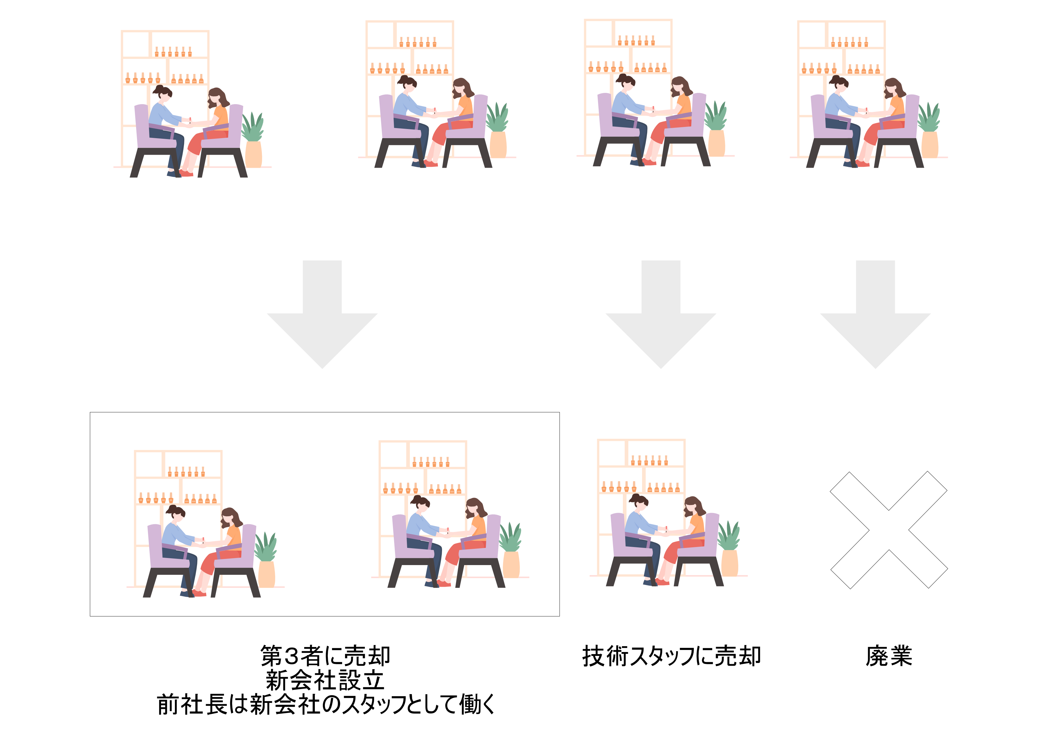 第二会社方式によって黒字化が見込める2店舗のみを買主が設立した新会社に売却し、元の会社は破産により整理しました。そのほか1店舗は赤字が大きかったので閉店し、もう1店舗は規模が小さかったことから担当スタッフに売却しました。